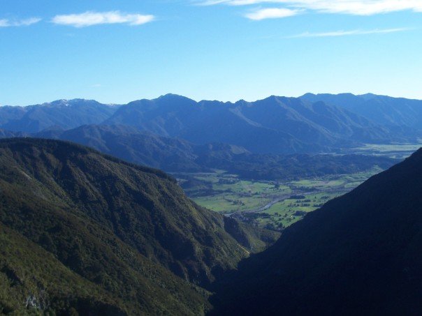 We began the day by getting up and having some good ol’ corn flakes with some peaches on top and some Milo. Then me, Adam, David, Damion, there oldest son Daniel (24), daughter Abby (9), Sean (6), Nathan (4), and Johnty (3) all went out tossed a rugby ball around and they taught me how to toss it and put the spin on it. Rugby is such a brutal sport and now I know most of the rules. I love it. The younger kids are also so friendly and fun to be around. Then we got in the car and drove to Kateriteri and saw some Kiwis do the mid-winter swim. Then we went up the hill and went to Kaka-Pah-Point. It has a big sign with arrows to places around the world and distances to them. Then we drove to Abel Tasman National Park and saw where many people start their hikes. We got some good pictures of Golden Bay from there. Then we drove up hill for a while and went to Hawke’s Point. We got some much better pics of the Bay from there because we were WAY up there. Adam, David, Damian, and me then threw rocks down the cliff and they stubbled for like 20 seconds through the trees. Then we got back in the car and went down this path around some hills where they filmed some of the Lord of the Rings scenes. They had limestone rocks filling the hills and they had had some weathering. We then reached Howard’s Hole. We went on 45 minute hike deep into a